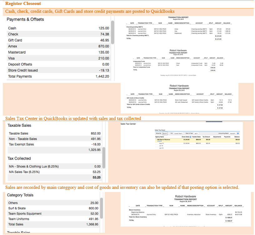 - Payments taken at the register: cash, checks, credit cards are reflected in whatever accounts you designate – for cash and checks you may want to post to un-deposited funds while credit cards you may wish to post direct to your checking account.