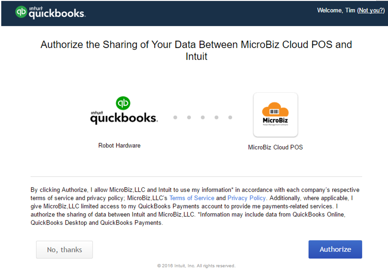 4. QuickBooks will ask you to authorize your MicroBiz instance to connect to QuickBooks. Click the Authorize button.