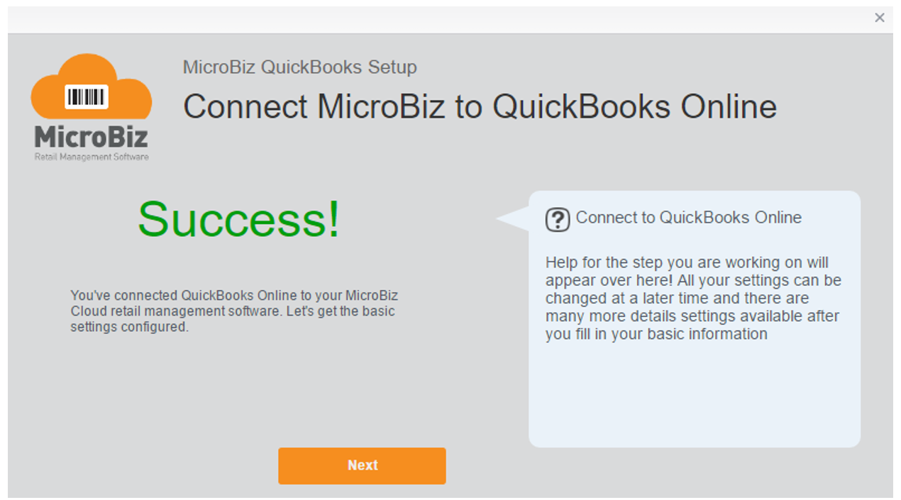 6. Success! the connection to QuickBooks is established. Now it's time to enter a few settings.