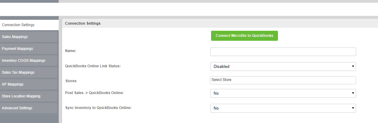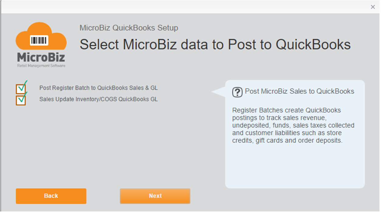 8. Select the QuickBooks GL account where you want your MicroBiz activity to post. If you need to you can change these settings later.