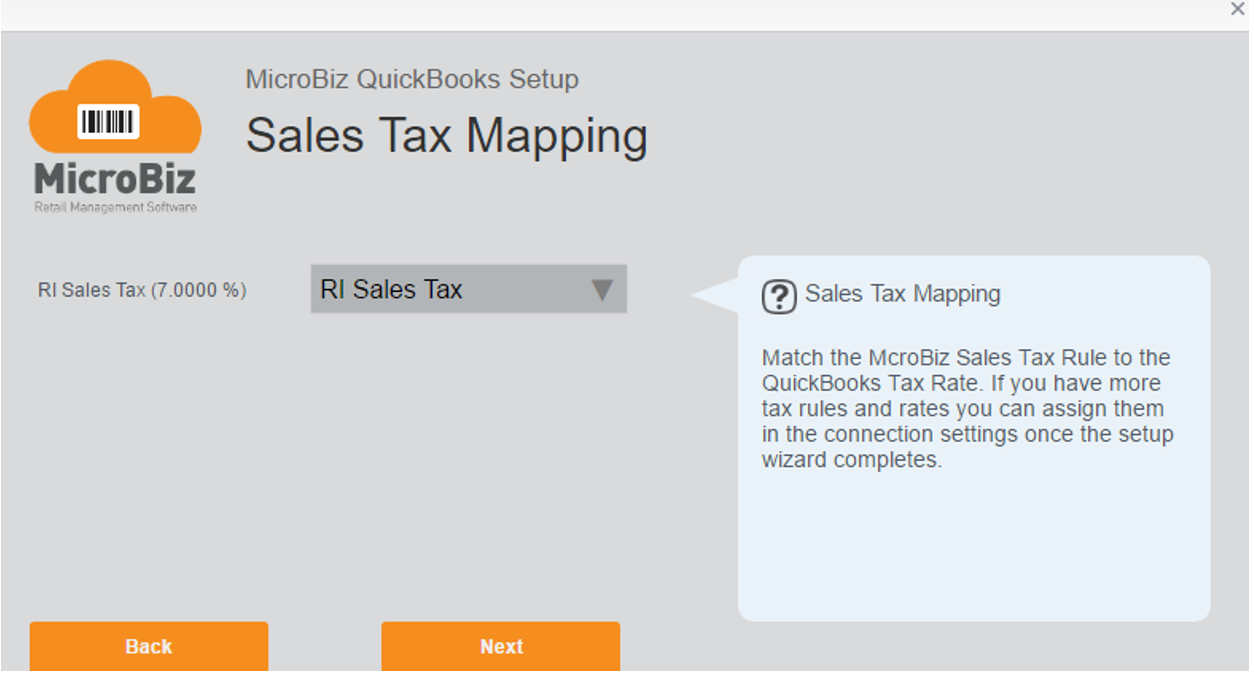 9. Match your MicroBiz Sales Tax to your QuickBooks Tax Agency. If you have additional stores in different tax jurisdictions you can set these up at the end of the process.