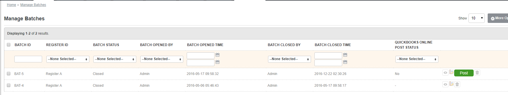 1. Go to Sales >> Manage Register Batches and Click the green Post button to the right of your batch. – your register closeout is posted to QuickBooks.