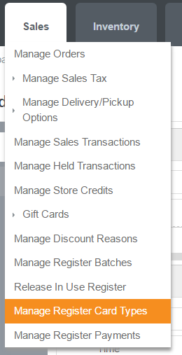 To add new "Register Card Type" navigate to Store Operations > Sales and select "Manage Register Card Types".